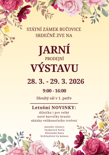 Na poslední březnový víkend (28. – 29. 3. 2026) připravila správa státního zámku Bučovice ve spolupráci s Květinářstvím Za Kašnou prodejní jarní výstavu v Dlouhém sále (1. patro zámku). Přijďte se tedy nejen potěšit, ale i nakoupit jarní a velikonoční aranžmá, doplňky a další výzdobu do vašich domů, bytů, balkónů atd. Letošní novinkou je tvořivá dílnička nejen pro děti, ale i pro dospělé, nové barvy kraslic a ukázky velikonočního tvoření a dalších jarních inspirací.