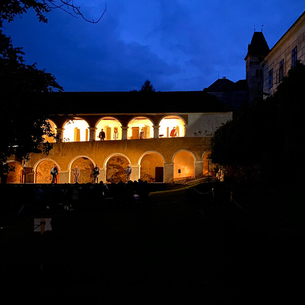 Večer otevře původní divadelní hra „Rytířova dcera“ v podání divadelního spolku Bouček – výpravný příběh o odvaze, touze po svobodě a síle jít proti osudu. Emotivní inscenace rozehraje arkády a zahradu zámku ve 20:30.